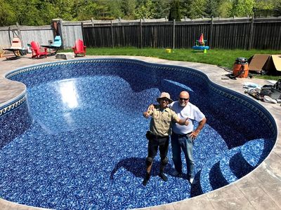 40% payment will be on the installation day. We need a Sunny day to install the liner. It takes 5-8 hours. then start fill the pool with your garden hose. we will put a vacuum machine to keep liner on the wall. we take it out when water at 1' over shallow end. and install jet and lights.